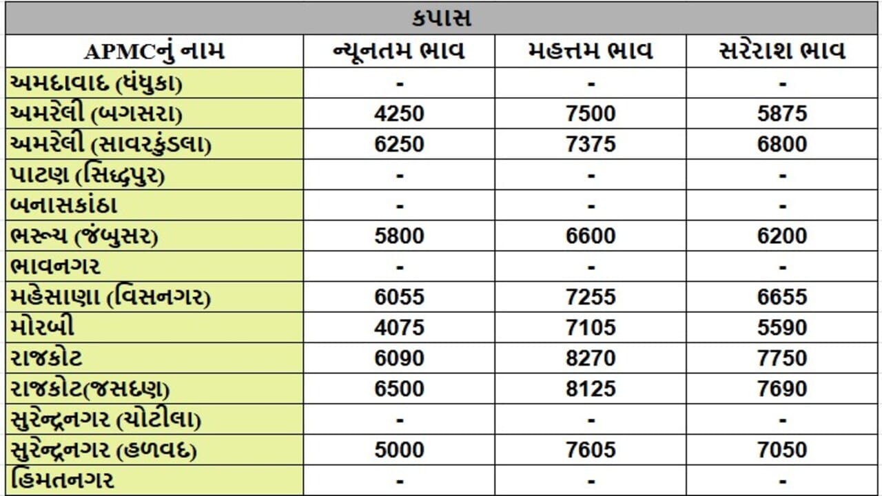કપાસના તા.16-09-2025ના રોજ APMCના ભાવ રૂ.4075 થી 8275 રહ્યા.