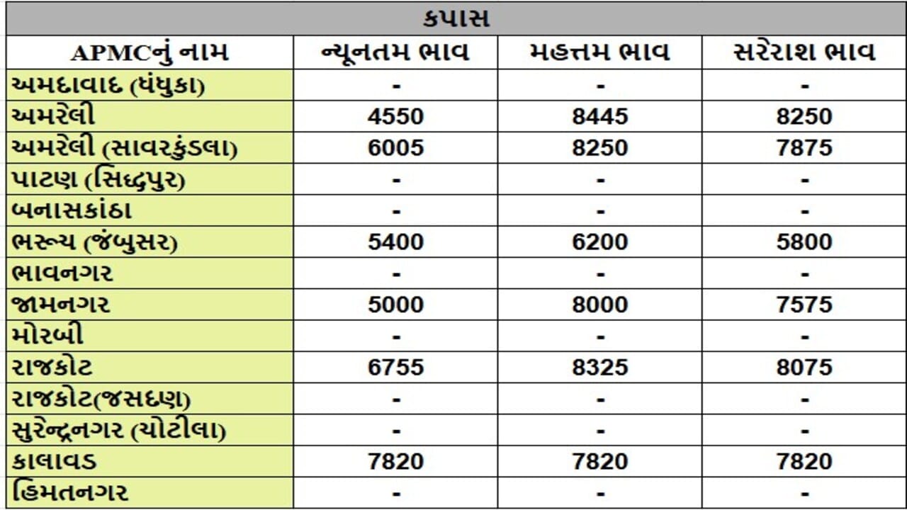 કપાસના તા.06-08-2025ના રોજ APMCના ભાવ રૂ.5000 થી 8445 રહ્યા.