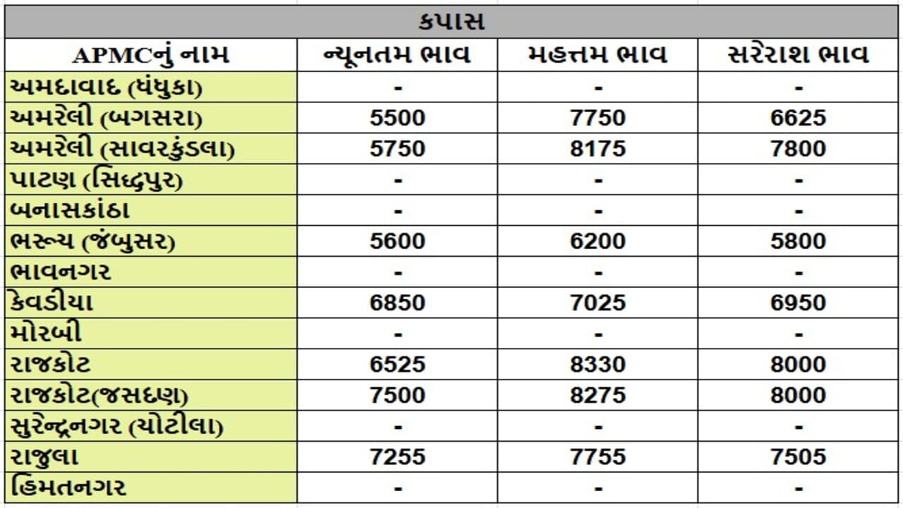 કપાસના તા.22-08-2025ના રોજ APMCના ભાવ રૂ.5500 થી 8330 રહ્યા.