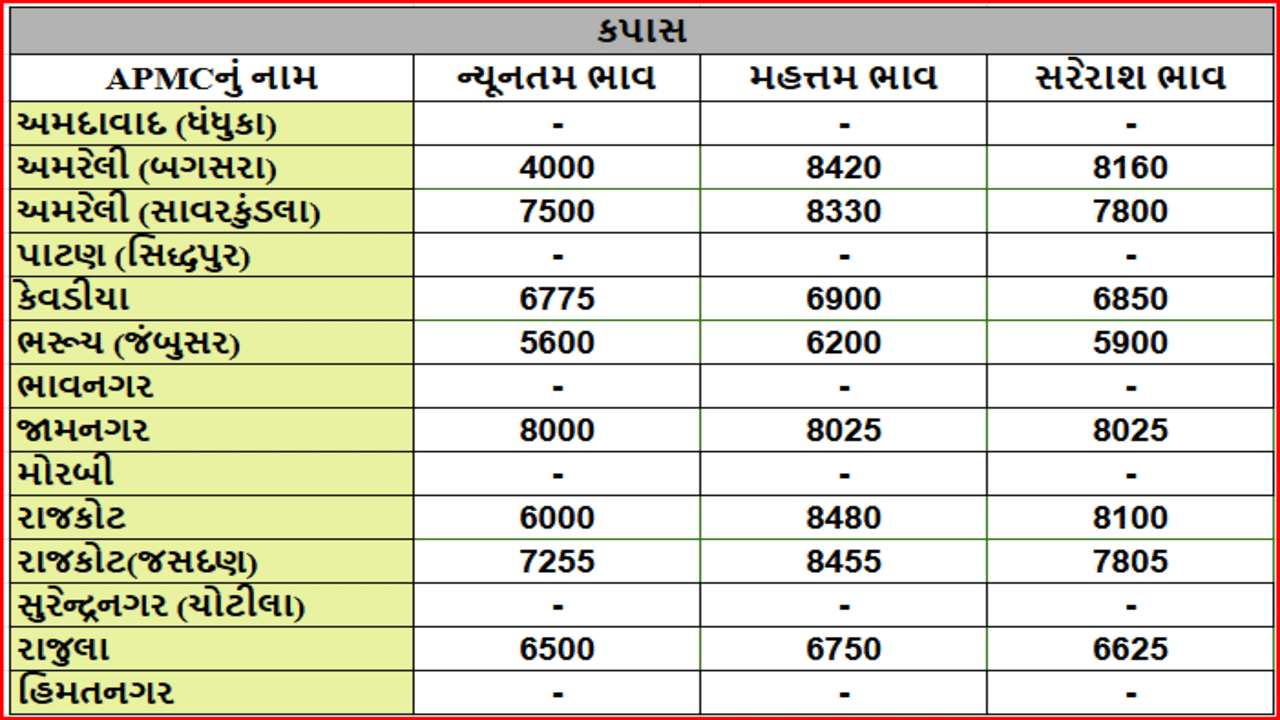 કપાસના તા.16-07-2025ના રોજ APMCના ભાવ રૂ.4000 થી 8480 રહ્યા.