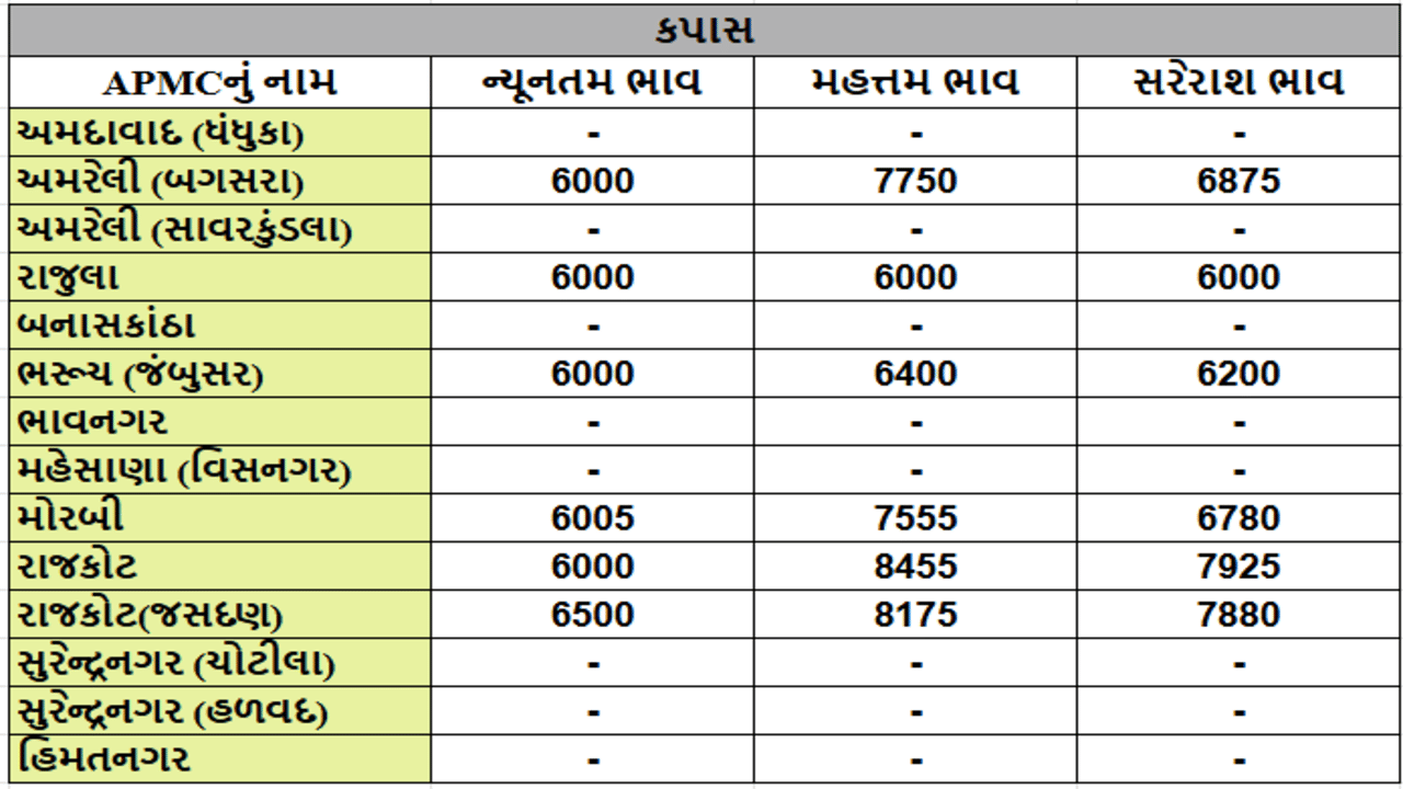 કપાસના તા.10-07-2025ના રોજ APMCના ભાવ રૂ.6000 થી 8455 રહ્યા.