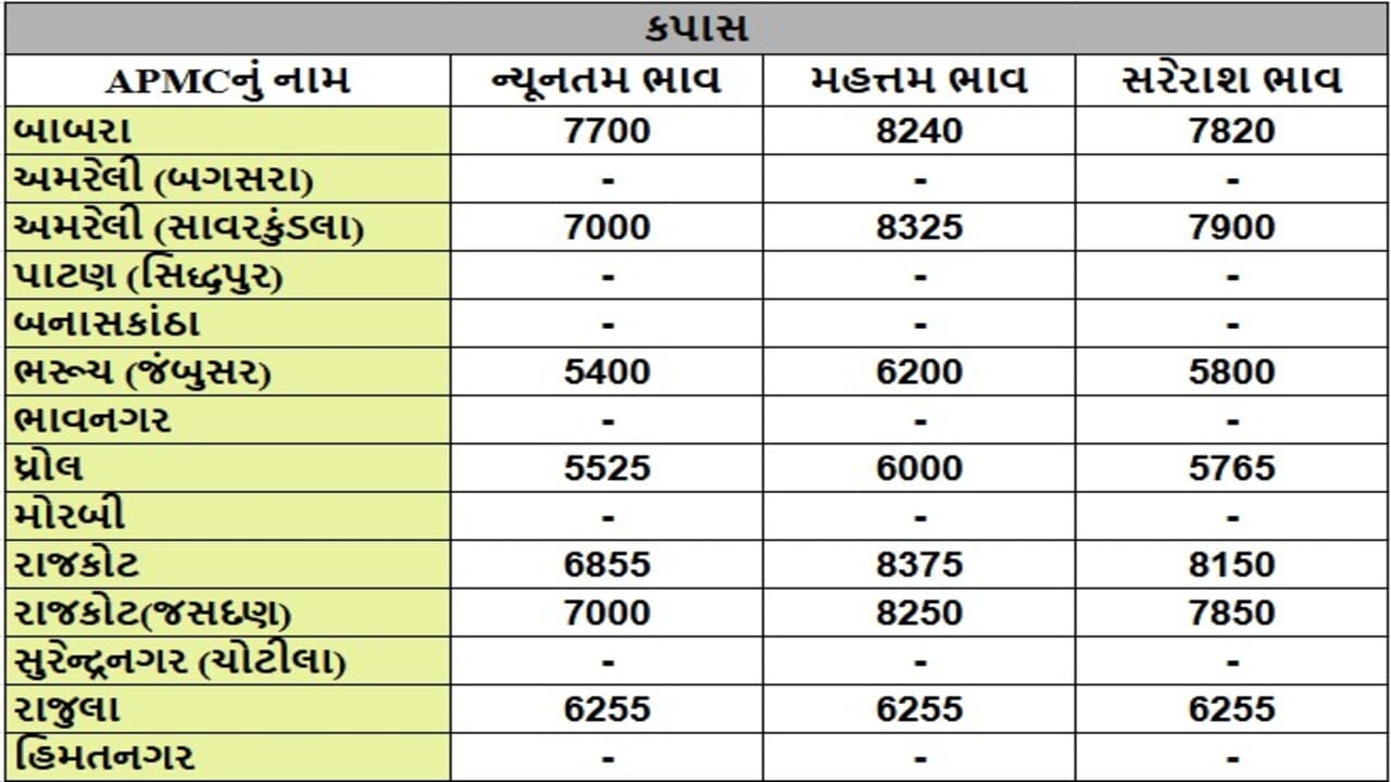 કપાસના તા.05-08-2025ના રોજ APMCના ભાવ રૂ.5400 થી 8375 રહ્યા.
