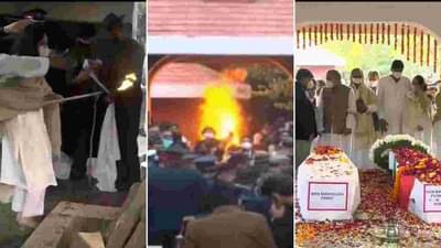 બેરાર સ્ક્વેર ખાતે અંતિમ સંસ્કાર દરમિયાન સીડીએસ રાવતના પરિવાર સિવાય સેનાના ત્રણ જવાન, રક્ષા મંત્રી રાજનાથ સિંહ, એનએસએ અજીત ડોભાલ, દિલ્હીના મુખ્યમંત્રી અરવિંદ કેજરીવાલ અને ઘણા મોટા અધિકારીઓ સામેલ થયા હતા. (ફોટો- ANI)