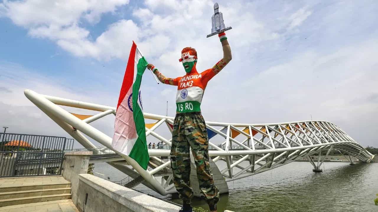 ભારતીય ત્રિરંગાના રંગોમાં સજ્જ એક વ્યક્તિ અમદાવાદમાં ISROના ચંદ્ર મિશન ચંદ્રયાન-3ના ઉતરાણ પહેલા અટલ બ્રિજ પાસે ધ્વજ લહેરાવ્યો હતો.
