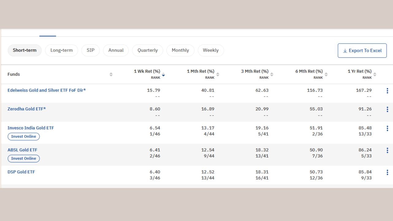 ગોલ્ડ ETF તેમના અત્યાર સુધીના ઉચ્ચતમ સ્તરને સ્પર્શી ગયા છે. ત્યારે કયા એ 5 ETF છે જેણે આ અઠવાડિયા દરમિયાના સારુ રિર્ટન આપ્યું છે ચાલો જાણીએ. જેમાં Edelweiss Gold and Silver ETF FoF Dir, Zerodha Gold ETF સહિત બીજ 3 ETF છે.