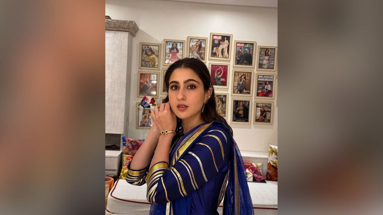 સારાએ બ્લૂ કલરનો સૂટ પહેર્યો હતો. તેણે ઘરમાં લીધેલી તસવીરો શેર કરી. બેકગ્રાઉન્ડમાં તેની માતા અને ભાઈની ફોટો ફ્રેમ છે. (Image: Instagram)