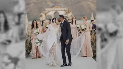 હાર્દિકની પત્નીનું આ ગાઉન 15 ફૂટ લાંબું હતું. 40 કારીગરોએ 50 દિવસમાં નતાશાનો આ સુંદર ઘૂંઘટ તૈયાર કર્યું છે. આ સિવાય નતાશાના ગાઉનની લાંબી ટ્યૂલ સ્લીવ્ઝમાં નતાશા અને હાર્દિકના લેટર લખેલા હતા. તેના પર 'NH' લખેલું હતું. (Instagram)