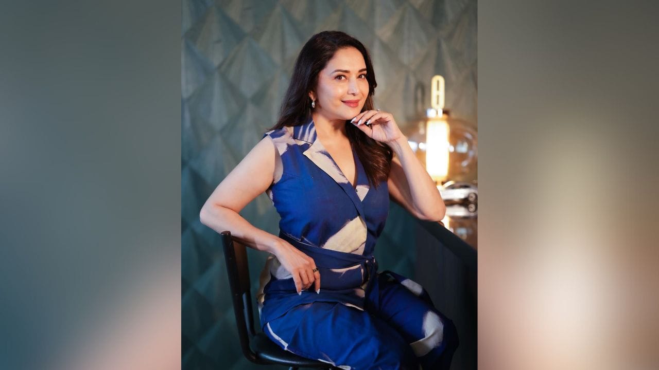 માધુરી દીક્ષિતે બ્લૂ ટાઈ અને ડાઈ સૂટમાં તેની કેટલીક તસવીરો સોશિયલ મીડિયા પર શેર કરી છે. તેના સૂટની ડિઝાઈન ક્લાસી લુક આપી રહી છે. (Image: Madhuri Dixit Instagram)