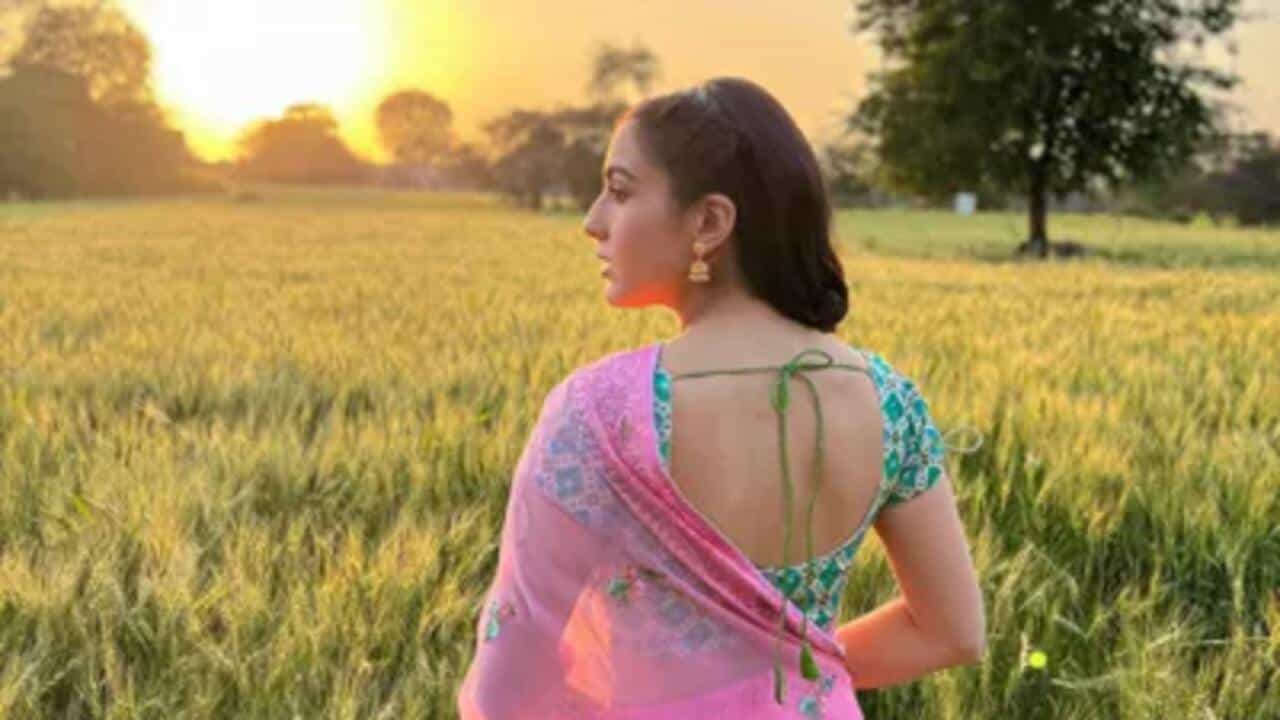 ફોટોમાં સારા કોઈ ગામડામાં દેશી અવતારમાં જોવા મળી રહી છે. હાથમાં બંગડીઓ અને ગુલાબી રંગની સાડી પહેરી અભિનેત્રી ખાટલા પર બેસેલી જોવા મળી રહી છે.