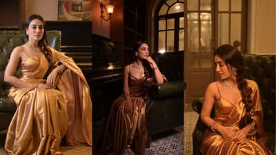 આ લેટેસ્ટ ફોટોઝમાં સુરભી જ્યોતિએ ગોલ્ડન કલરની સિમ્પલ સાટીન સાડી પહેરી છે અને એક જ દોરી પર બાંધેલો બ્લાઉઝ સાથે કૈરી કર્યો છે. (Image: Instagram)