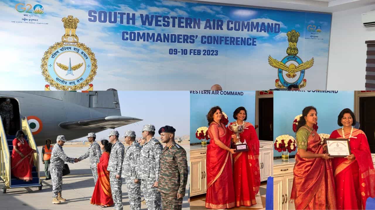 દક્ષિણ પશ્ચિમી એર કમાન્ડના એર ઓફિસર કમાન્ડિંગ-ઇન-ચીફ, એર માર્શલ વિક્રમસિંહ અને એરફોર્સ ફેમિલીઝ વેલ્ફેર એસોસિએશનના પ્રમુખ ડૉ. આરતીસિંહ, 09 ફેબ્રુઆરી 2023ના રોજ જેસલમેરના એરફોર્સ સ્ટેશન ખાતે દક્ષિણ પશ્ચિમી એર કમાન્ડ (SWAC)ના કમાન્ડરોની પરિષદમાં ભાગ લેવા માટે પહોંચ્યા હતા.