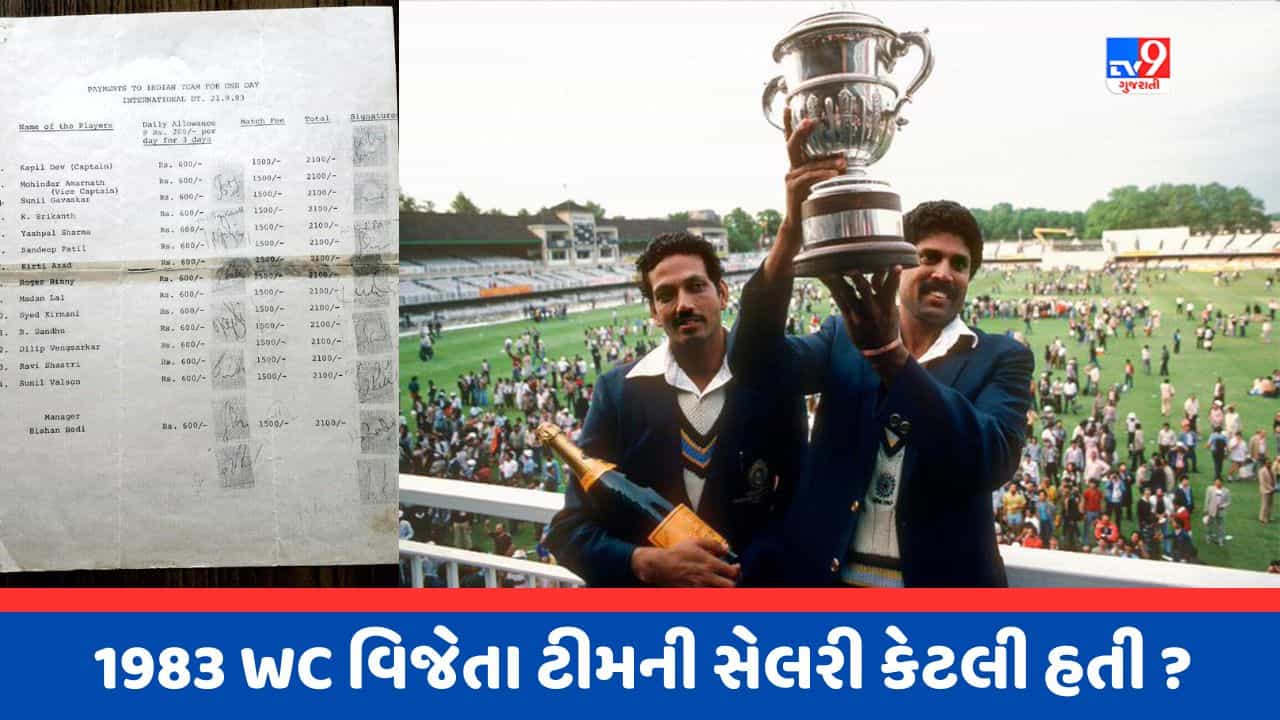 ભારતીય ખેલાડીઓને એક મેચ દીઠ દૈનિક ભઠ્ઠા રુપે 600 રુપિયા, મેચ ફીસ 1500 રુપિયા એટલે કે કુલ 2100 રુપિયાની સેલેરી મળતી હતી. વાયરલ થયેલા ફોટોમાં સપ્ટેમ્બર મહિનાની સેલેરી સ્લિપ જોવા મળી રહી છે. આ સ્લિપ વર્લ્ડ કપ જીત્યાના 2 મહિના પછીની છે. સેલેરી સ્પિલનો આ ફોટો સોશિયલ મીડિયા પર વાયરલ થઈ રહ્યો છે, TV9 ગુજરાતી આ ફોટોની પુષ્ટિ કરતુ નથી. (PC Credit - Twitter)