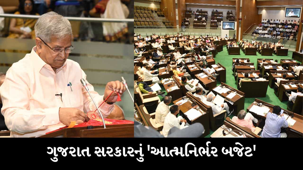 આજે વિધાનસભામાં ગુજરાતનું આત્મનિર્ભર બજેટ રજૂ કરવામાં આવ્યું છે. ભૂપેન્દ્ર પટેલ સરકારની બીજી ટર્મમાં સતત બીજી વખત નાણાપ્રધાન કનુ દેસાઈ બજેટ રજૂ કર્યું છે. જે રીતે કેન્દ્રીય બજેટમાં પણ આત્મનિર્ભરતા પર વધારે ધ્યાન કેન્દ્રિત કરવામાં આવ્યું છે તે જ રીતે રાજ્ય સરકાર પણ આત્મનિર્ભર થીમ પર બજેટ રજૂ કરી શકે તેવી સંભાવના હતી.