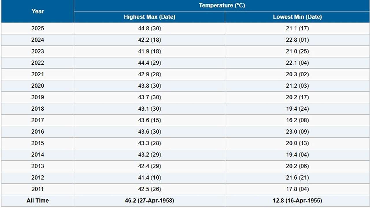ગુજરાતના અમરેલી અને ગાંધીનગરમાં પાછલા કેટલાક વર્ષના એપ્રિલ મહિનાની નોંધાયેલ ગરમી કરતા પણ આજે વધુ ગરમી નોંધાઈ છે. ગુજરાતના હરિયાળા પાટનગર ગાંધીનગરમાં, 2017 બાદ આજે 2026ની 26મી એપ્રિલના રોજ 44.2 ડિગ્રી ગરમી નોંધાઈ છે. જ્યારે અમરેલીમાં 2019ની 28મી એપ્રિલે 44.9 ડિગ્રી ગરમી નોંધાઈ હતી. ત્યાર બાદ આજે 44.5 ડિગ્રીએ પારો પહોચ્યો છે. જાણો ગુજરાતના વિવિધ શહેરોમાં છેલ્લા 15 વર્ષમાં એપ્રિલ મહિનામાં નોંધાયેલ ગરમીના આંકડા અંગે.