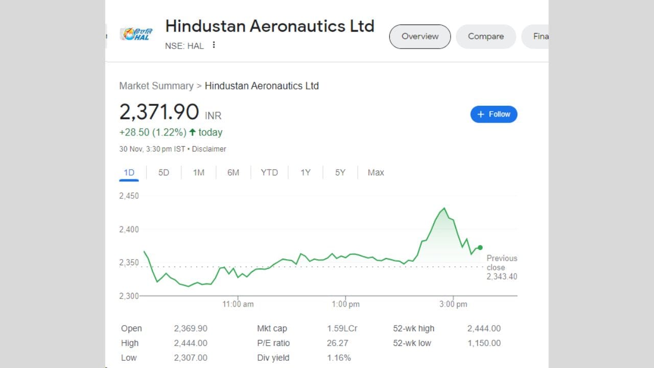 હિન્દુસ્તાન એરોનોટિક્સ લિમિટેડ એટલે કે HAL ના શેર ગુરુવાર, 30 નવેમ્બરના રોજ સતત ચોથા સત્રમાં 52 વીકના હાઈ લેવલ પર પહોંચ્યો હતો. આજે રક્ષા મંત્રાલયના અધિકારીઓએ હજારો કરોડ રૂપિયાના સંરક્ષણ પ્રોજેક્ટ અંગે નિર્ણય લેવા માટે મીટિંગ કરી હતી. તેના કારણે આજે શેરના ભાવમાં 28.50 રૂપિયાનો વધારો થયો છે.