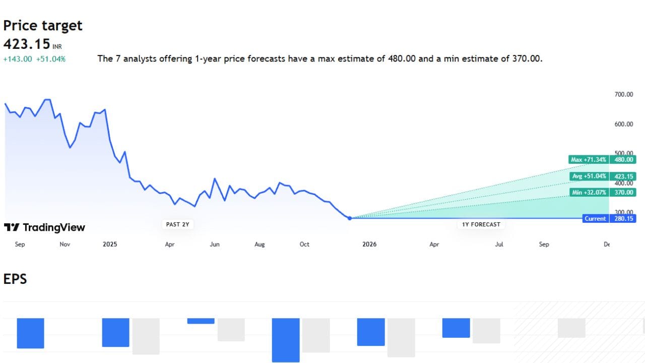 Brainbees Solutions Limited કંપનીના હાલના શેર પ્રાઈઝ 280 રુપિયા પર ટ્રેડ થઈ રહ્યો છે. તેના ભવિષ્યમાં MAX પ્રાઈઝ 480 તેમજ MIN પ્રાઈઝ 370 સુધી રહેવાની શક્યતા છે.