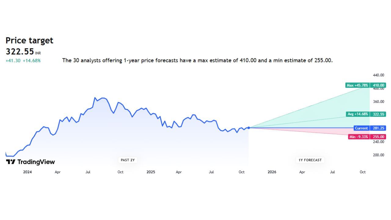 Petronet Lng Limited કંપનીના શેર પ્રાઈઝ અને ચાર્ટ આપવામાં આવ્યો છે. આ કંપનીના શેરની પ્રાઈઝ અત્યારે 281.25 ચાલી રહી છે. ભવિષ્યમાં આ કંપનીના ભાવ MAX પ્રાઈઝ 410 સુધી જાય તેવી શક્યતા છે અને MIN પ્રાઈઝ 255 સુધી રહે તેવી શક્યતાઓ છે.