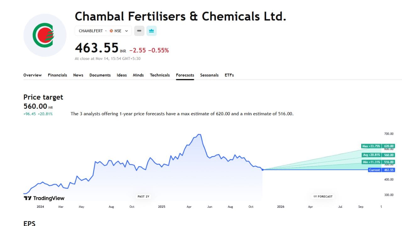 Chambal Fertilisers & Chemicals Ltd કંપનીનું 3 નિષ્ણાતે ફોરકાસ્ટ કર્યું છે. જેમાં નિષ્ણાતોએ ખરીદવા માટે સૂચના આપી છે.