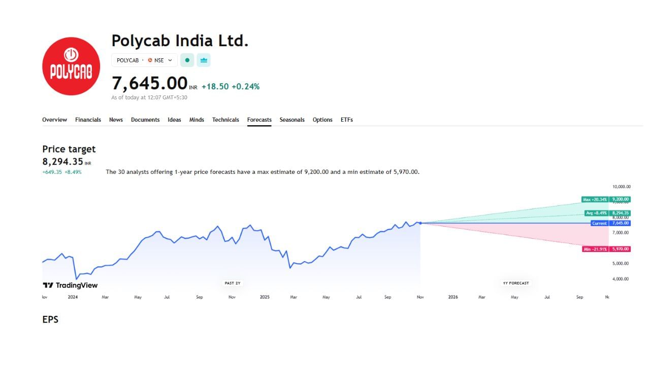 Polycab India Ltdના ફોરકાસ્ટ ઉપરના ફોટામાં દર્શાવવામાં આવ્યો છે. આ ફોટામાં 1 વર્ષનું ફોરકાસ્ટ ગ્રાફના માધ્યમથી દર્શાવવામાં આવ્યું છે. આ કંપનીનું એનાલિસિસ 30 એક્સપર્ટે કરેલું છે. તે 1 વર્ષમાં LTના Max પ્રાઈઝ 9,200 થાય તેવી સંભાવના દર્શાવવામાં આવી છે. ત્યારે Min પ્રાઈઝ 5,970 થાય તેવી શક્યતા એક્સપર્ટે વ્યક્ત કરી છે.