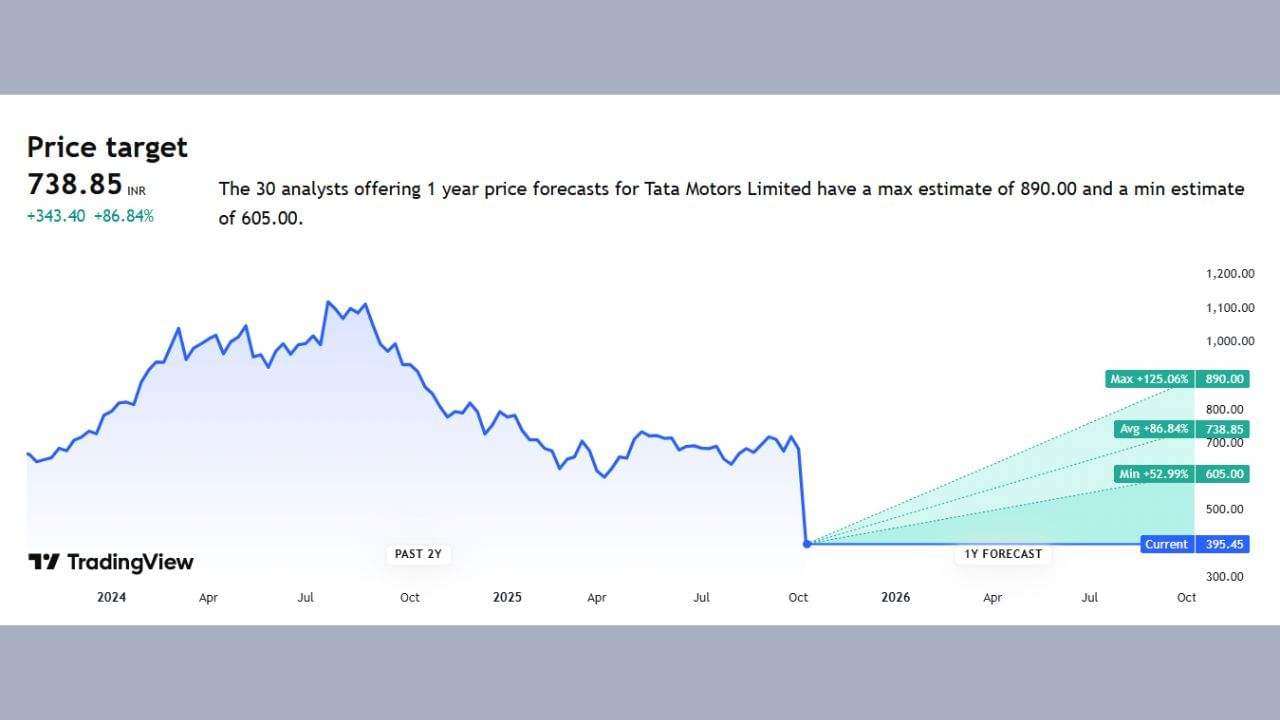 આપણે ટાટા મોટર્સનું ફોરકાસ્ટ ઉપરના ફોટોમાં જોઈએ તો આપણને ખબર પડે છે કે તે કંપનીનું એનાલિસિસ 30 એક્સપર્ટે કરેલું છે. મોટા ભાગનો તેનો ગ્રાફ ગ્રીન કલરમાં જોવા મળે છે. એક વર્ષના ફોરકાસ્ટમાં તેની હાલની પ્રાઈઝ 395.45 છે. તો તે વધીને MAX પ્રાઈઝ +125% સુધી વધી શકે છે. MIN પ્રાઈઝ +52% સુધી રહી શકે છે.