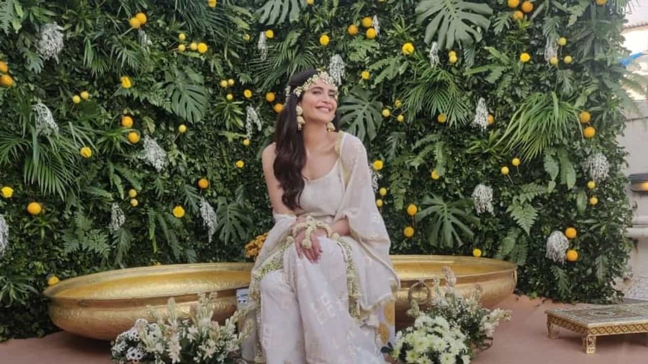 કરિશ્માએ હલ્દીમાં સફેદ અને ગોલ્ડન કલરનો સૂટ પહેર્યો છે. આ સાથે તેણે ફૂલની જ્વેલરી પહેરી છે.