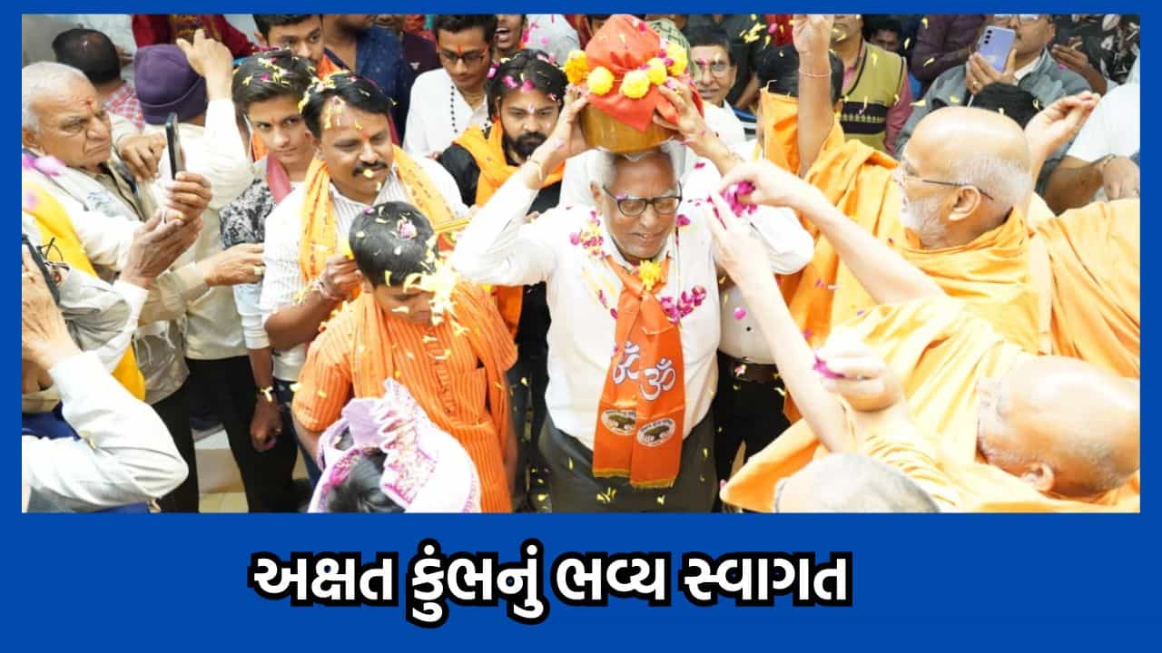 વિશ્વ હિન્દૂ પરિષદ મહેસાણા દ્વારા યોજાયેલ અક્ષતકુંભની નગરયાત્રા બીએપીએસ સ્વામિનારાયણ મંદિર મહેસાણા આવી પહોંચી ત્યારે અક્ષતકુંભનું ભક્તિ ભાવસભર ભવ્ય સ્વાગત કરવામાં આવ્યું