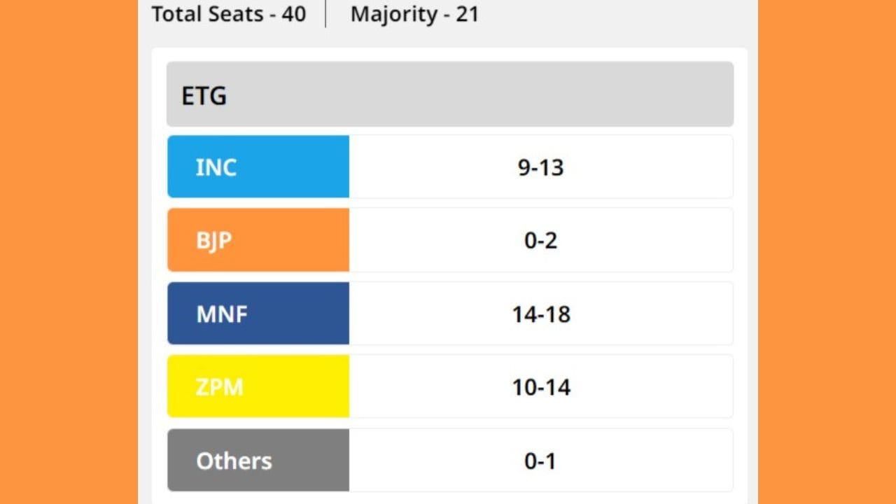 'ઈટીજી'એ આપેલા રિપોર્ટ મુજબ કોંગ્રેસ 09 થી 13 સીટો હાંસલ કરી શકે છે તેમજ ભાજપના પક્ષે 02 સીટો આવી શકે છે. 14થી 18 MNFના પક્ષે જઈ શકે છે અને ZPM પક્ષમાં 10થી 14 સીટો આવી શકે છે.