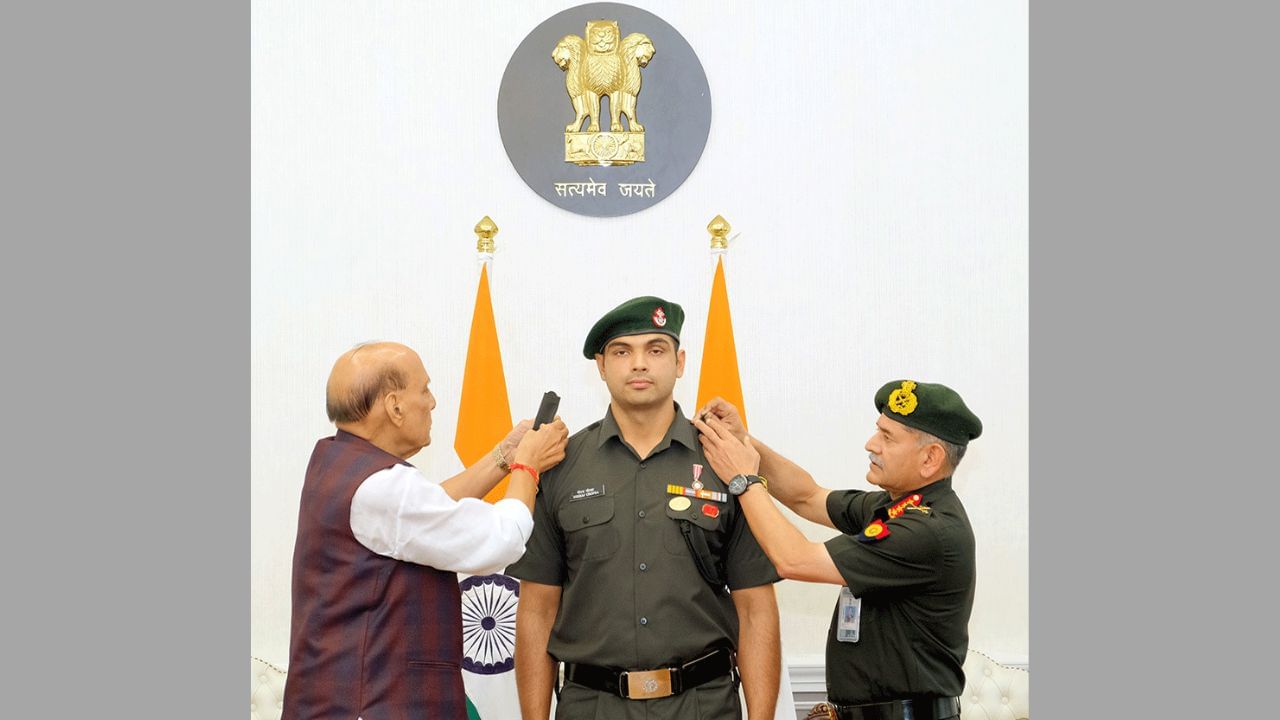 ઓલિમ્પિક સુવર્ણ ચંદ્રક વિજેતા અને સ્ટાર ભાલા ફેંકનાર નીરજ ચોપરાને બુધવારે ઔપચારિક રીતે પ્રાદેશિક સેનામાં લેફ્ટનન્ટ કર્નલનો માનદ પદ એનાયત કરવામાં આવ્યો હતો, સંરક્ષણ પ્રધાન રાજનાથ સિંહે તેમને "દ્રઢતા, દેશભક્તિ અને શ્રેષ્ઠતા માટે પ્રયત્નશીલ રહેવાની ભારતીય ભાવનાનું પ્રતિક" ગણાવ્યા હતા.