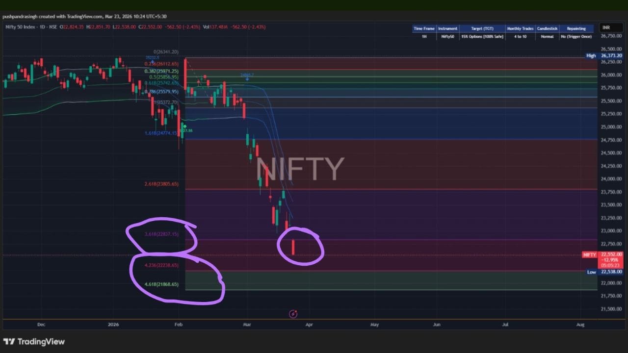 19 માર્ચ, 2026ના રોજ જે આગાહી કરવામાં આવી હતી તે જ હવે સાચી પડી છે. તે સમયે, એવું કહેવામાં આવ્યું હતું કે Fibonacchi Tool મુજબ, જો નિફ્ટી 22,837ના સ્તરને પાર કરે છે અને થોડા સમય માટે તેની નીચે ટ્રેડિંગ ચાલુ રાખે છે, તો તે અનિવાર્યપણે 22,238ના સ્તર તરફ આગળ વધશે.