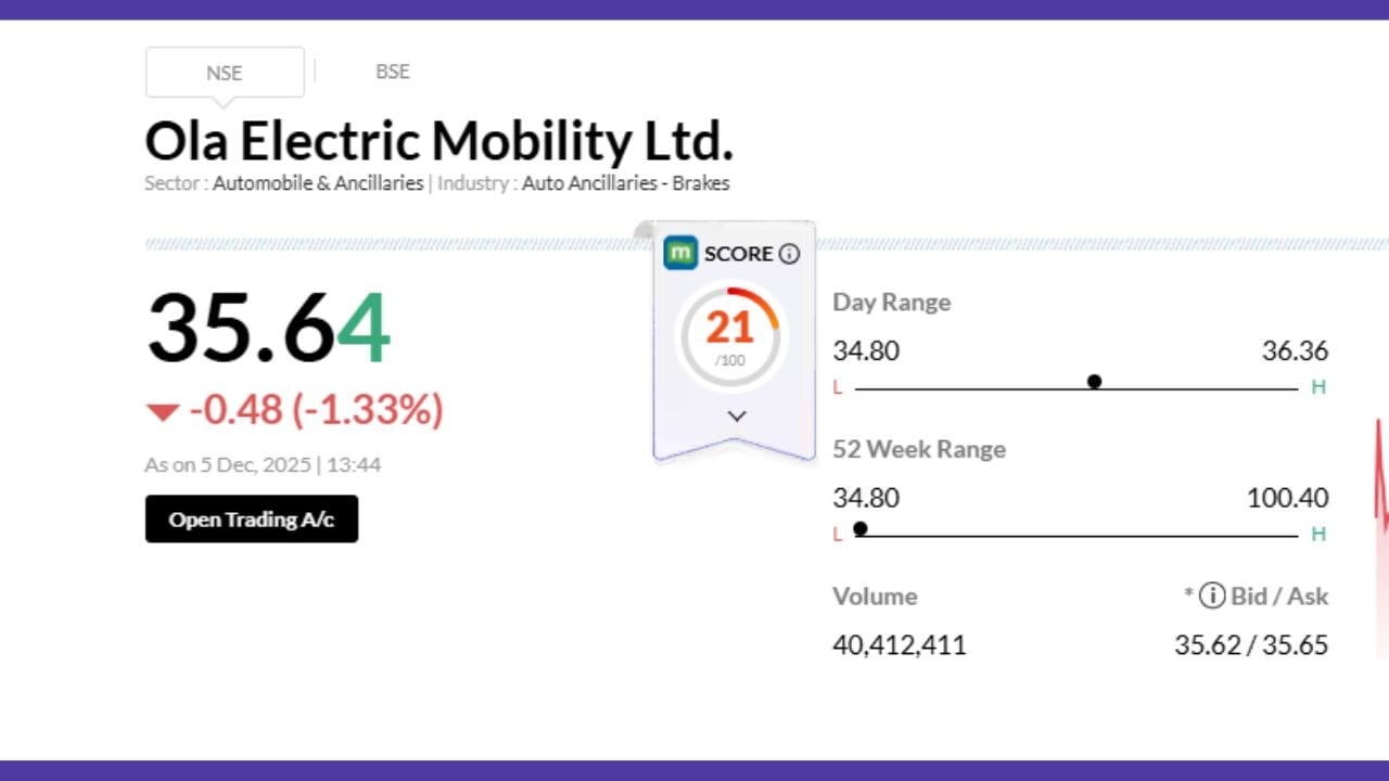 ઓલા ઇલેક્ટ્રિકના શેરમાં તીવ્ર ઘટાડો ચાલુ છે. ગુરુવારે કંપનીનો શેર અત્યાર સુધીના સૌથી નીચા ભાવે પહોંચ્યો હતો અને શુક્રવારે સવારે વધુ ઘટીને ₹34.80 થયો હતો - જે તેના IPO ભાવ ₹76 ના અડધાથી પણ ઓછો હતો. શુક્રવારે બપોરે 12 વાગ્યે, શેર ₹35.80 પર ટ્રેડ થઈ રહ્યો હતો, જે ₹76 નો હતો.