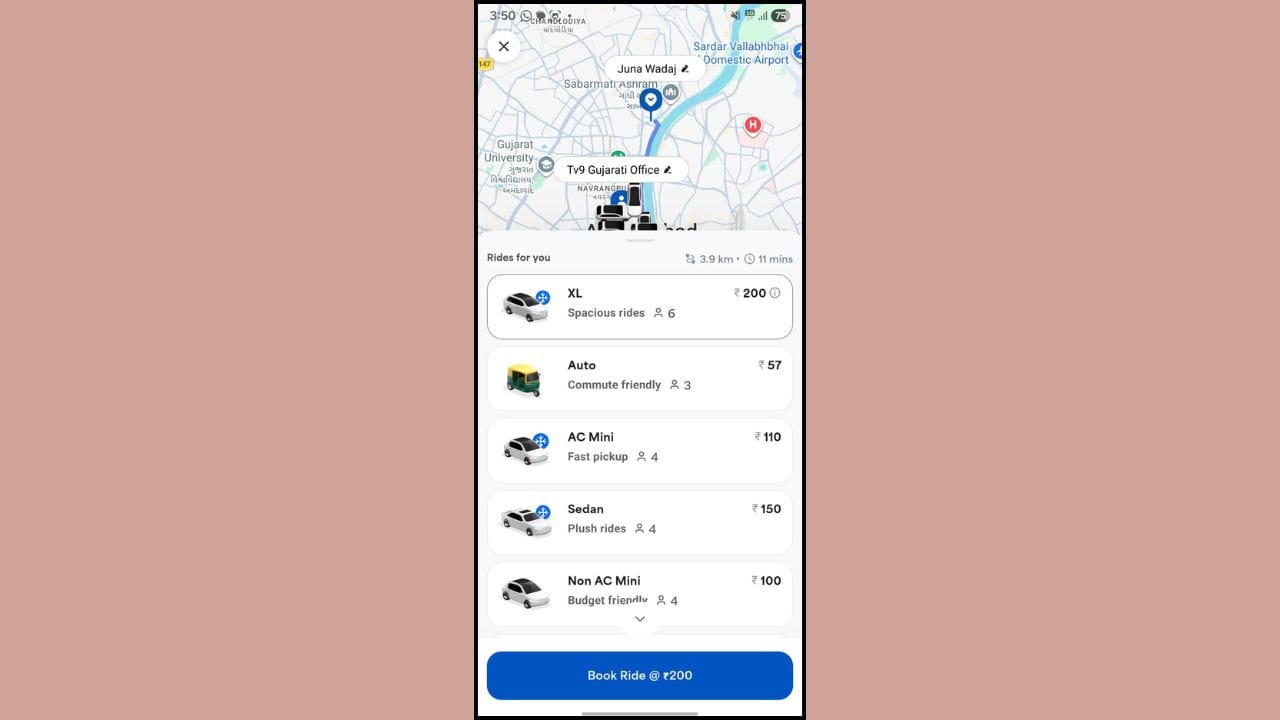 અમદાવાદમાં મુસાફરી કરતા લોકો માટે ભાડાની બચત કરવી હવે સરળ બની છે. ખાસ કરીને TV9 ગુજરાતી ઓફિસથી જૂના વાડજ જવા માટે અલગ-અલગ એપ્સના ભાડામાં મોટો તફાવત જોવા મળે છે. જણાવી દઈએ કે, આ ભાડું પિક અવર્સ (4:00 To 4:30) મુજબનું છે.