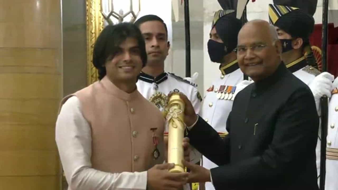 ટોક્યો ઓલિમ્પિકસમાં સુવર્ણ ચંદ્રક વિજેતા ભાલા ફેંકનાર નીરજ ચોપરાને રાષ્ટ્રપતિ રામનાથ કોવિંદ તરફથી પદ્મશ્રી પુરસ્કારથી સન્માનિત કરવામાં આવ્યા છે.