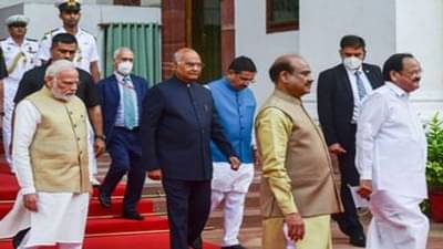 રાષ્ટ્રપતિ રામ નાથ કોવિંદ વચ્ચે છે અને એક તરફ ઉપરાષ્ટ્રપતિ વેંકૈયા નાયડુ અને બીજી તરફ લોકસભા સ્પીકર ઓમ બિરલા અને તેમની પાછળ વડાપ્રધાન મોદી છે. સેન્ટ્રલ હોલમાં પહોંચતા જ તમામ સાંસદો અને મંત્રીઓ તેમના સન્માનમાં ઉભા થઈ ગયા હતા. (ANI)