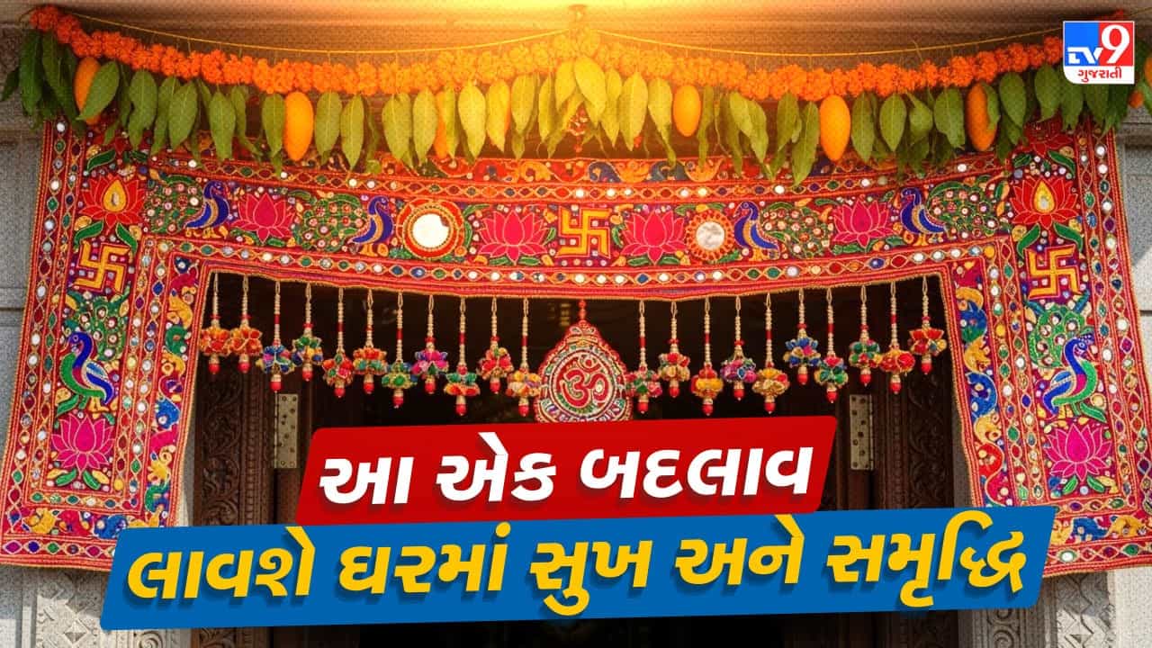 હિંદુ પરંપરામાં મંદિરના દરવાજા પર તોરણ લગાવવાનું ખાસ મહત્વ માનવામાં આવે છે. તે સામાન્ય રીતે દરેક શુભ પ્રસંગે ઉપયોગમાં લેવાય છે અને ઘરમાં સકારાત્મક ઊર્જા વધારવામાં મદદરૂપ થાય છે. ખાસ કરીને કેરી અને આસોપાલવના પાંદડાથી બનેલા તોરણ વધુ પ્રચલિત છે. પરંતુ થોડા સમય પછી આ પાંદડા સુકાઈ જાય છે. જ્યોતિષ અને વાસ્તુ અનુસાર, આવા સુકાયેલા પાંદડા દરવાજા પર રાખવાથી ઘરની સમૃદ્ધિ પર નકારાત્મક અસર પડી શકે છે અને નકારાત્મક ઊર્જા વધે છે. તેથી, આ વિષયમાં કયા વાસ્તુ નિયમો અને ઉપાયો અપનાવવા જોઈએ તે જાણવું જરૂરી બને છે. ( Credits: AI Generated )