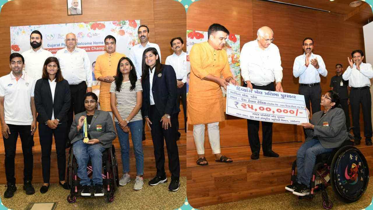 તેમજ પેરા ટેબલ ટેનિસમાં સિંગલ ઇવેન્ટમાં ગોલ્ડ મેડલ પ્રાપ્ત ભાવિના પટેલને રૂપિયા 25 લાખ, બ્રોન્ઝ મેડલ પ્રાપ્ત દિવ્યાંગ ખેલાડી સોનલ પટેલને રૂપિયા 10 લાખની પુરસ્કાર રાશિના ચેક અર્પણ કર્યા હતા.