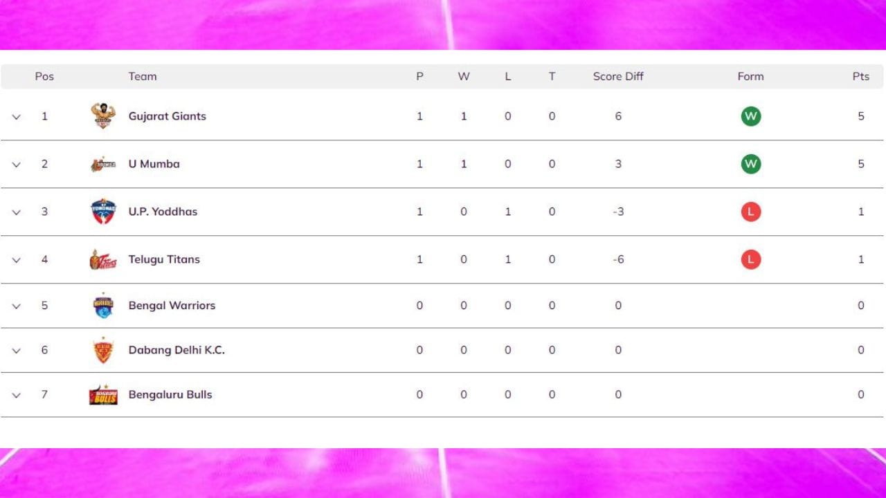 2 ડિસેમ્બરના રોજ પહેલા દિવસની રમત બાદ ગુજરાત જાયન્ટસની ટીમે 5 પોઈન્ટ સાથે પોઈન્ટસ ટેબલમાં પહેલા ક્રમે છે. જ્યારે યુ મુમ્બા ટીમ સ્કોરના તફાવતને કારણે 5 પોઈન્ટ સાથે બીજા ક્રમે છે. યુપી યુદ્ધા અને તેલુગુ ટાઈટન્સની ટીમની હાર થતા 1-1 પોઈન્ટ સાથે અનુક્રમે ત્રીજા અને ચોથા ક્રમે છે.