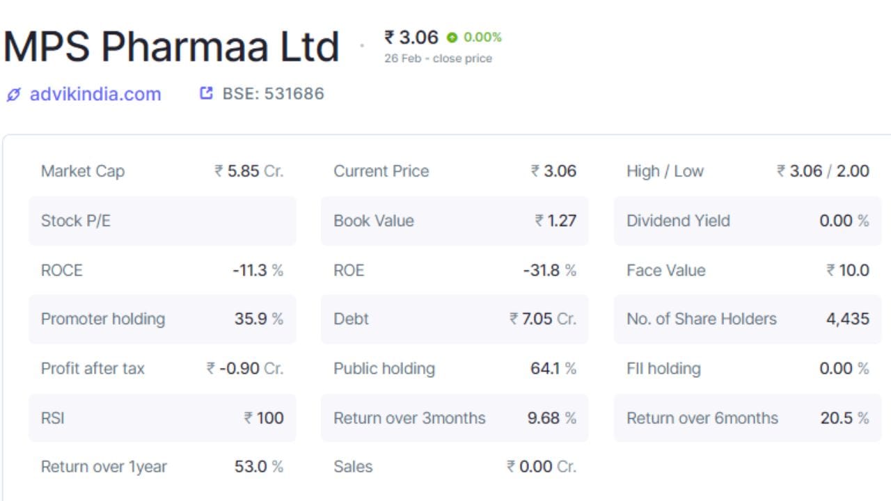 1. MPS Pharmaa Ltd: કંપનીમાં પ્રમોટર્સ હોલ્ડિંગ 35.9 ટકા છે, જ્યારે પબ્લિક હોલ્ડિંગ 64.1 ટકા છે. કંપનીમાં કુલ 4,435 શેરહોલ્ડર્સ છે. કંપનીનું કુલ માર્કેટ કેપ 5.85 કરોડ રૂપિયા છે, જ્યારે દેવું 7.05 કરોડ રૂપિયા છે. કંપનીનો ટેક્સ બાદનો નફો -0.90 કરોડ રૂપિયા છે. RSI 100 છે અને સેલ્સ ઝીરો છે. કંપનીએ ત્રણ મહિનામાં 9.68 ટકા, છ મહિનામાં 20.5 ટકા અને એક વર્ષમાં 53 ટકા રિટર્ન આપ્યું છે.