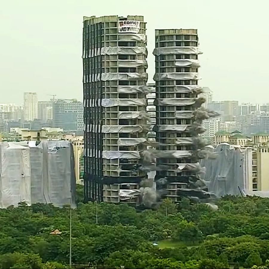 નોઈડાના સેક્ટર-93-Aમાં સ્થિત સુપરટેકના બંને ટ્વિન ટાવર 'એપેક્સ' અને 'સિયાન'ને રવિવારે તોડી પાડવામાં આવ્યા હતા. વિસ્ફોટ પછી થોડી જ સેકન્ડોમાં વિશાળ ઈમારત પત્તાના મહેલની જેમ ધરાશાયી થઈ ગઈ. આ ગેરકાયદેસર રીતે બાંધવામાં આવેલા ટ્વીન ટાવર્સને તોડી પાડવાના સુપ્રીમ કોર્ટના આદેશના એક વર્ષ બાદ આ કાર્યવાહી કરવામાં આવી છે. બંને ટાવરના ડિમોલિશનને કારણે 3,000 ટ્રક કાટમાળ નીકળ્યો છે.