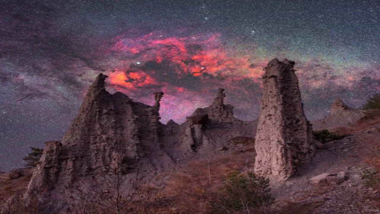આ ફોટોમાં દેખાતી મહેલ જેવી વસ્તુ સ્પાયર્સ હૂડૂસના નામથી જાણીતી છે. તે લાખો વર્ષ જૂના હોવાનું માનવામાં આવે છે.આ ફોટો ઘણો જૂનો નથી પણ તેની પાછળ દેખાતી ગેલેક્સી ઘણી જૂની છે.