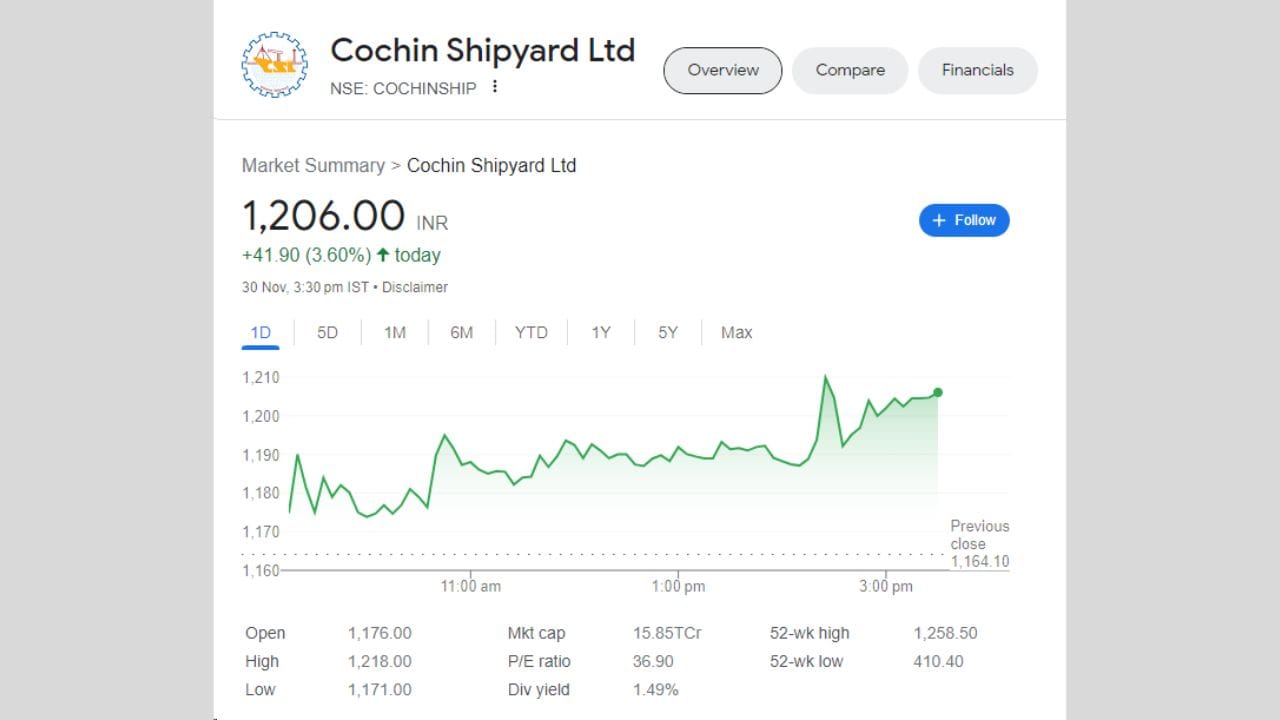 કોચીન શિપયાર્ડ લિમિટેડના શેરે છેલ્લા 5 દિવસમાં 8.38 ટકાનું રિટર્ન આપ્યું છે. જો આપણે રૂપિયામાં ગણતરી કરીએ તો તે 93.25 રૂપિયા થાય છે.