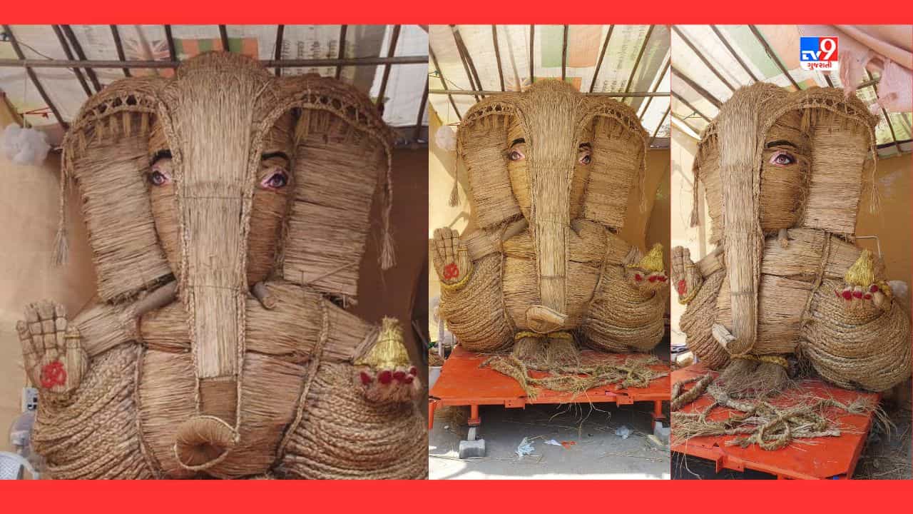 Vadodara: કારેલીબાગમાં વલ્લભનગર સોસાયટીના રહીશોએ ગણેશજીની 13 ફુટ ઉંચી ઘાસના પુળામાંથી પ્રતિમા બનાવી છે. જેના માટે ડાંગરના ઘાસના 400 જેટલા પુળાનો ઉપયોગ કર્યો છે.