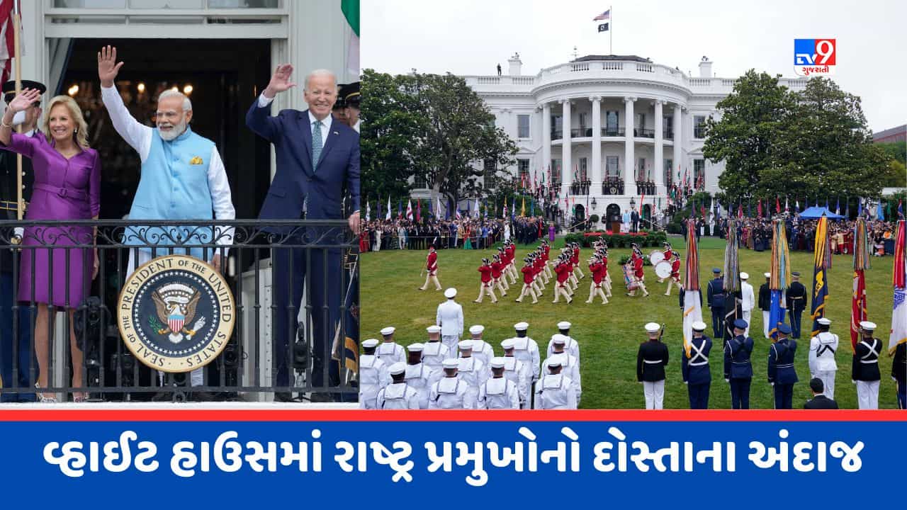 વ્હાઈટ હાઉસની સાઉથ લોનની બાલકનીમાં ઉભા રહીને નરેન્દ્ર મોદી, જો બાઈડન અને જિલ બાઈડને લોકોનું અભિવાદન કર્યું હતું.