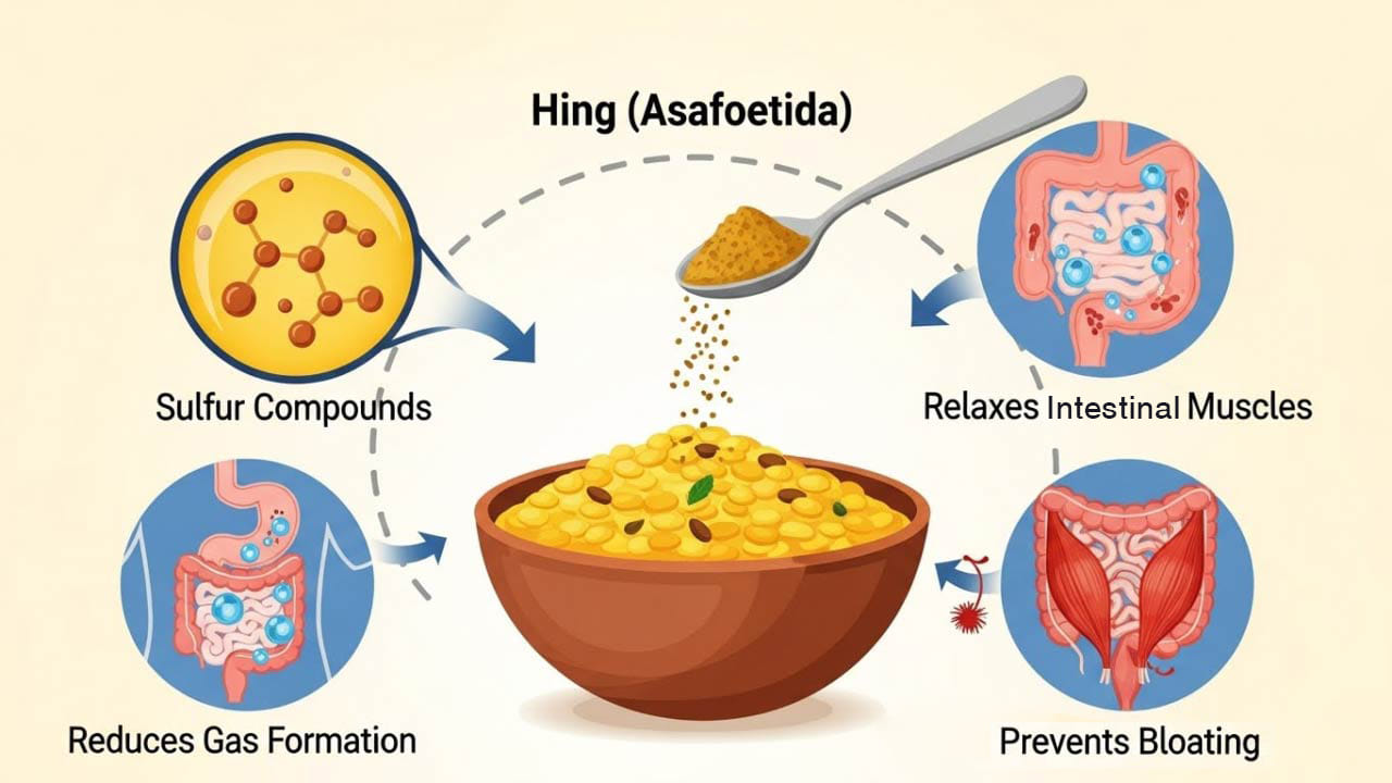 દાળમાં હીંગ નાખવાનું કારણ માત્ર સ્વાદ વધારવા માટે નથી, તેના પાછળ વૈજ્ઞાનિક કારણ પણ જોડાયેલું છે. હીંગમાં રહેલા સલ્ફર તત્ત્વો પેટમાં ગેસ બનવાની પ્રક્રિયા ઘટાડે છે અને આંતરડાની માસપેશીઓને આરામ આપે છે. જેના કારણે પેટ ફૂલવું જેવી સમસ્યાઓ ઓછી થાય છે.