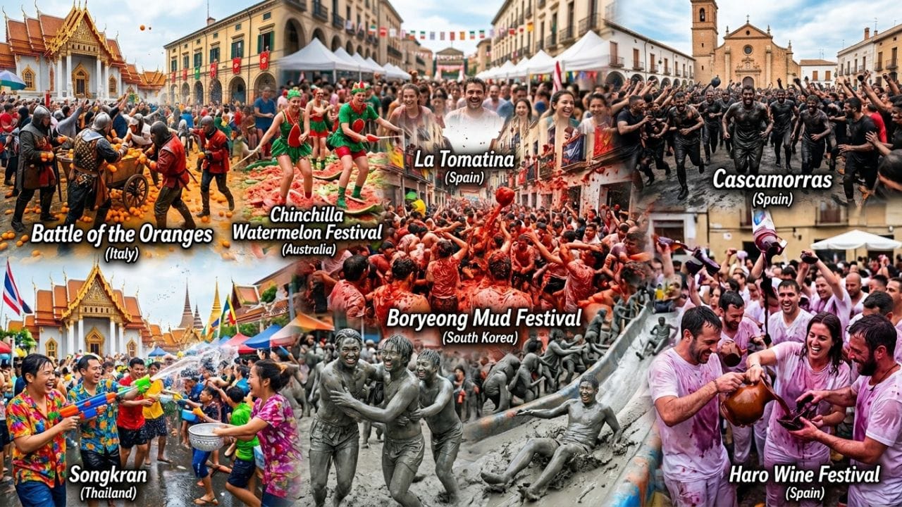બેટલ ઓફ ધ ઓરેન્જિસ (ઈટાલી - Battle of the Oranges): ઈટાલીના ઇવ્રિયા શહેરમાં 1808થી આ પરંપરા ચાલી આવે છે. અહીં લોકો એકબીજા પર લગભગ 400 ટન સંતરા ફેંકે છે. હસી-મજાક અને તોફાન આ તહેવારને હોળી જેવો જ જોશીલો બનાવે છે.