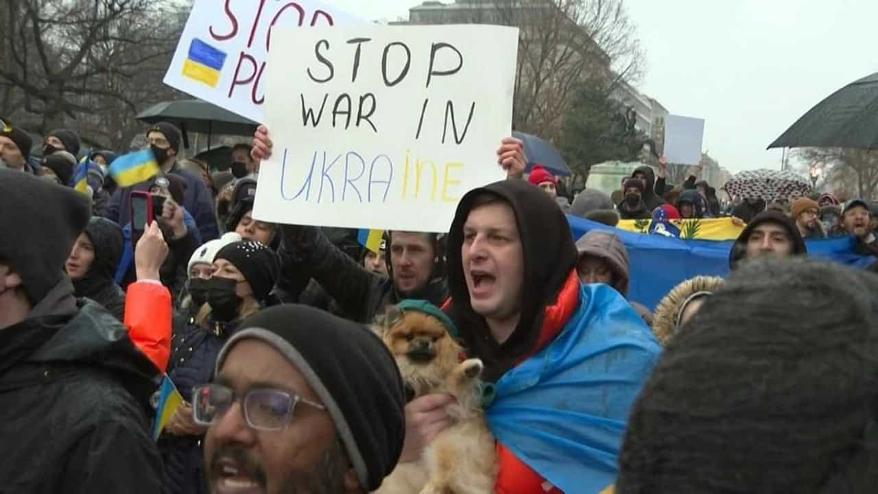 યુક્રેન પર હુમલા બાદ યુક્રેન સાથે એકતા દર્શાવવા વોશિંગ્ટન ડીસીમાં વ્હાઇટ હાઉસની બહાર ડઝનબંધ વિરોધીઓ એકત્ર થયા હતા. હુમલાના પહેલા દિવસે 137 યુક્રેનિયન માર્યા ગયા હતા.