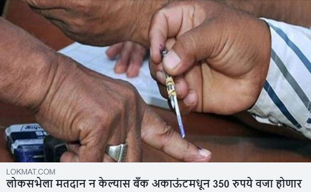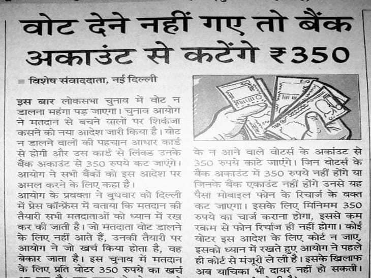 ઘણાં બધા મીડિયા અહેવાલો અને ન્યૂઝપેપરના કટિંગના આધારે એવી ખબરો ફેલાવવામાં આવી રહી છે કે જો તમે મત આપવા નહીં જાવ તો તમારા બેંક ખાતામાંથી 350 રુપિયા કપાઈ જશે. વધારેમાં ખબર એવી પણ છે કે જે લોકોની પાસે બેંક ખાતા પણ નથી તેઓ જ્યારે મોબાઈલ ફોન રિચાર્જ કરાવશે ત્યારે તેના રિચાર્જમાંથી પૈસા કપાઈ જશે.