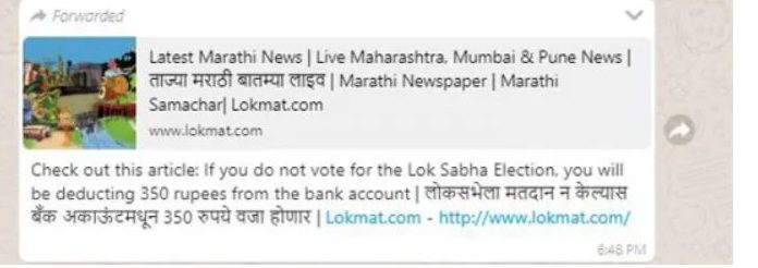 ચૂંટણીના માહોલમાં ઘણીબધી ખબરો આપણા વિવિધ સોશિયલ મીડિયા પ્લેટફોર્મમાં જોવા મળતી હોય છે. એક ખબર એવી પણ ચાલી રહી છે કે જો તમે વોટ આપવા નહીં જાવ તો તમારા ખાતામાંથી 350 રૂપિયા કપાઈ જશે.