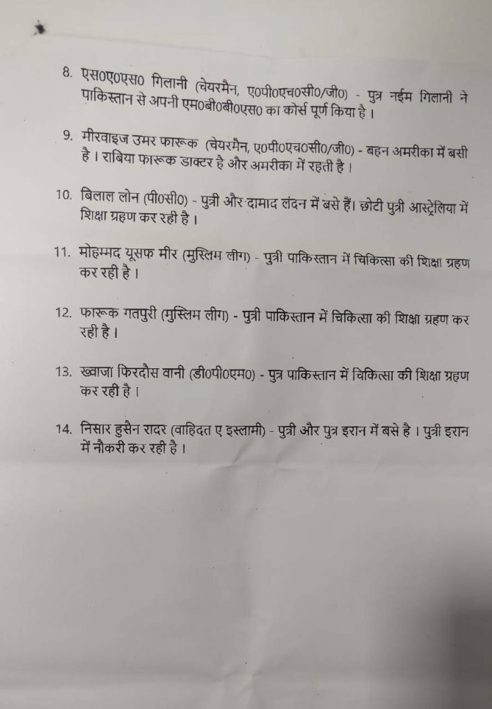 આ યાદીમાં એ નેતાઓના નામ છે જે કાશ્મીરની શાંતિ પર શર્પની જેમ કુંડળી મારીને બેસી ગયા છે. કાશ્મીરના અનેક યુવાનોએ હાથમાં પથ્થર ઉઠાવ્યા છે. જેની પાછળ આ પ્રકારના અલગાવવાદીઓ જવાબદાર છે. જે ઉંમરમાં યુવાનોને રોજગાર માટે મહેનત કરવાનો સમય છે ત્યારે અલગવાવાદીઓ પોતાના સ્વાર્થને પુરો કરવા પથ્થરબાજોની જમાત બનાવી રહ્યા છે.
