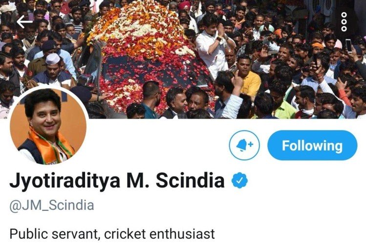 ભાજપના નેતા અને પૂર્વ કેન્દ્રીય પ્રધાન જ્યોતિરાદિત્ય સિંધિયાએ તેમના ટ્વિટર એકાઉન્ટ પરથી ‘ભાજપ’ હટાવ્યું હોવાની ચર્ચાએ વેગ પકડ્યો હતો. તેમની ટ્વિટર પ્રોફાઈલ પર ભજપના બદલે, તેમણે જાહેર સેવક અને ક્રિકેટ પ્રેમી લખી દિધું છે અને ત્યારબાદ અનેક અટકળો શરુ થઈ હતી. કેટલાક લોકો કહે છે કે સિંધિયાએ ભાજપને તેમની પ્રોફાઇલમાં ઉમેર્યા જ નહોતો. જો કે આ અંગે હજુ ભાજપ કે સિંધિયા તરફથી કોઈ પ્રતિક્રિયા મળી નથી.