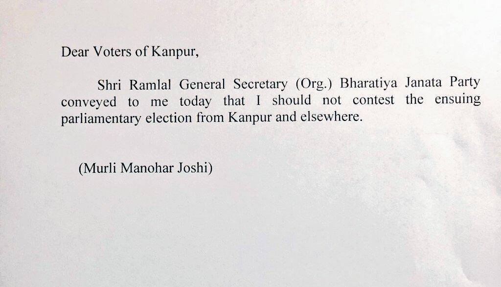 આ અંગે મળી રહેલી માહિતી અનુસાર સોમવારના રોજ ભાજપના સંગઠન મહાસચિવ મુરલી મનોહર જોશી સાથે મુલાકાત કરી હતી. મુરલી મનોહર જોશીને કહ્યું કે પાર્ટીએ નક્કી કર્યું છે કે તમને ચૂંટણી લડાવામાં આવશે નહીં. રામલાલે કહ્યું કે પાર્ટી ઇચ્છે છે કે તમે પાર્ટી ઓફિસ આવી ચૂંટણી નહીં લડવાની જાહેરાત કરો. જો કે પાર્ટીની આ અપીલને મુરલી મનોહર જોશી એ સીધી રીતે નકારી દીધી.